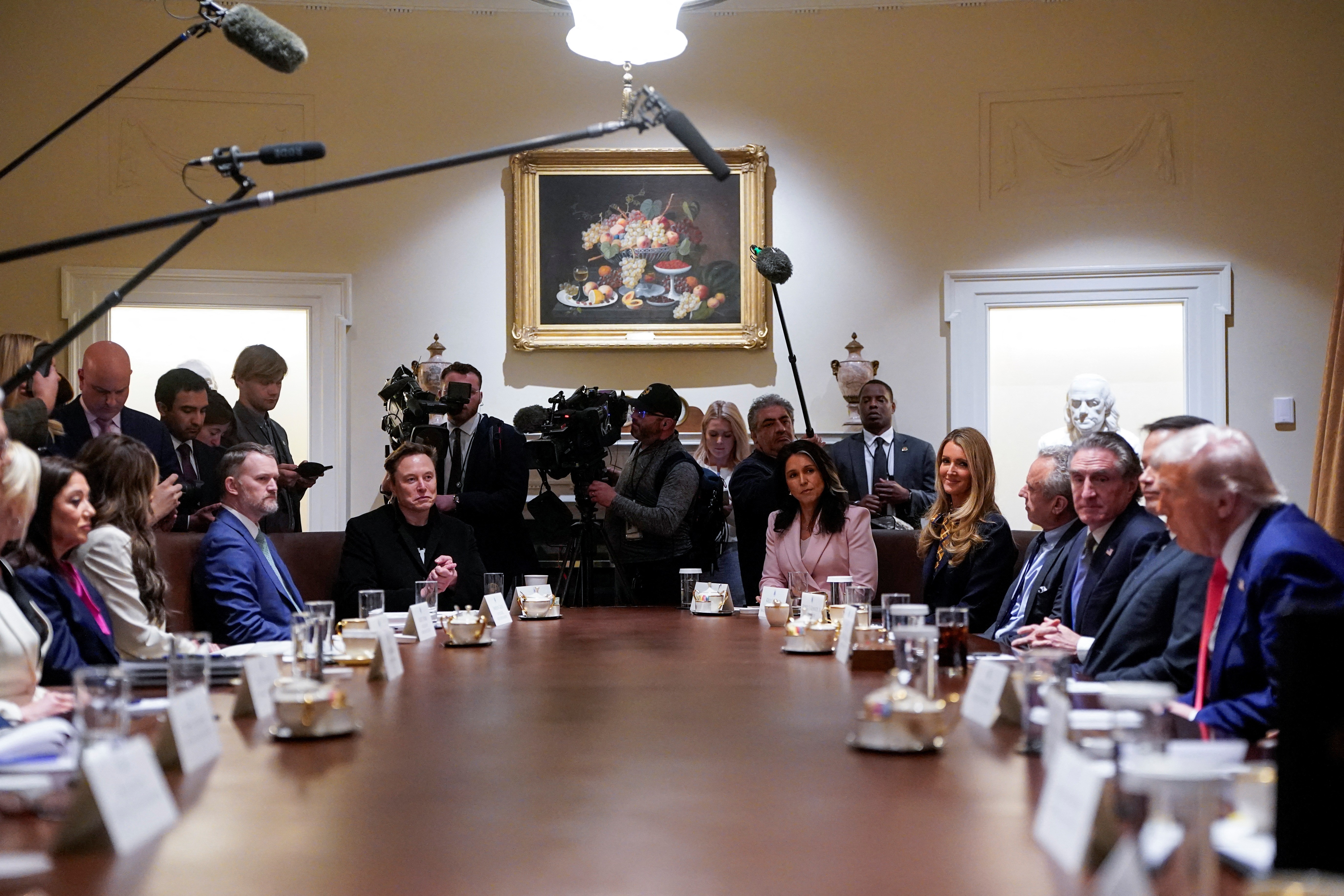 Perfil oficial do governo dos Estados Unidos mostra entrevistas que explicam medidas econômicas e escalada tarifária. Reunião na de Donald Trump com assessores e membros da equipe na Casa Branca