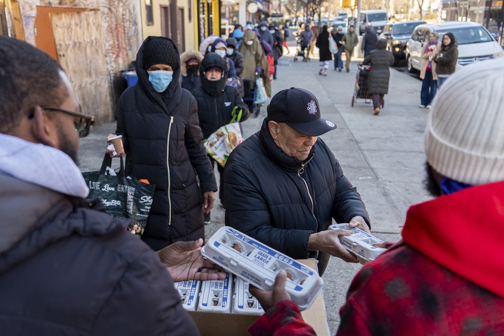 Pessoas fazem fila para distribuição de ovos em Nova York diante de escassez e alto preço do produto em supermercados dos EUA, em 21 de março de 2025.