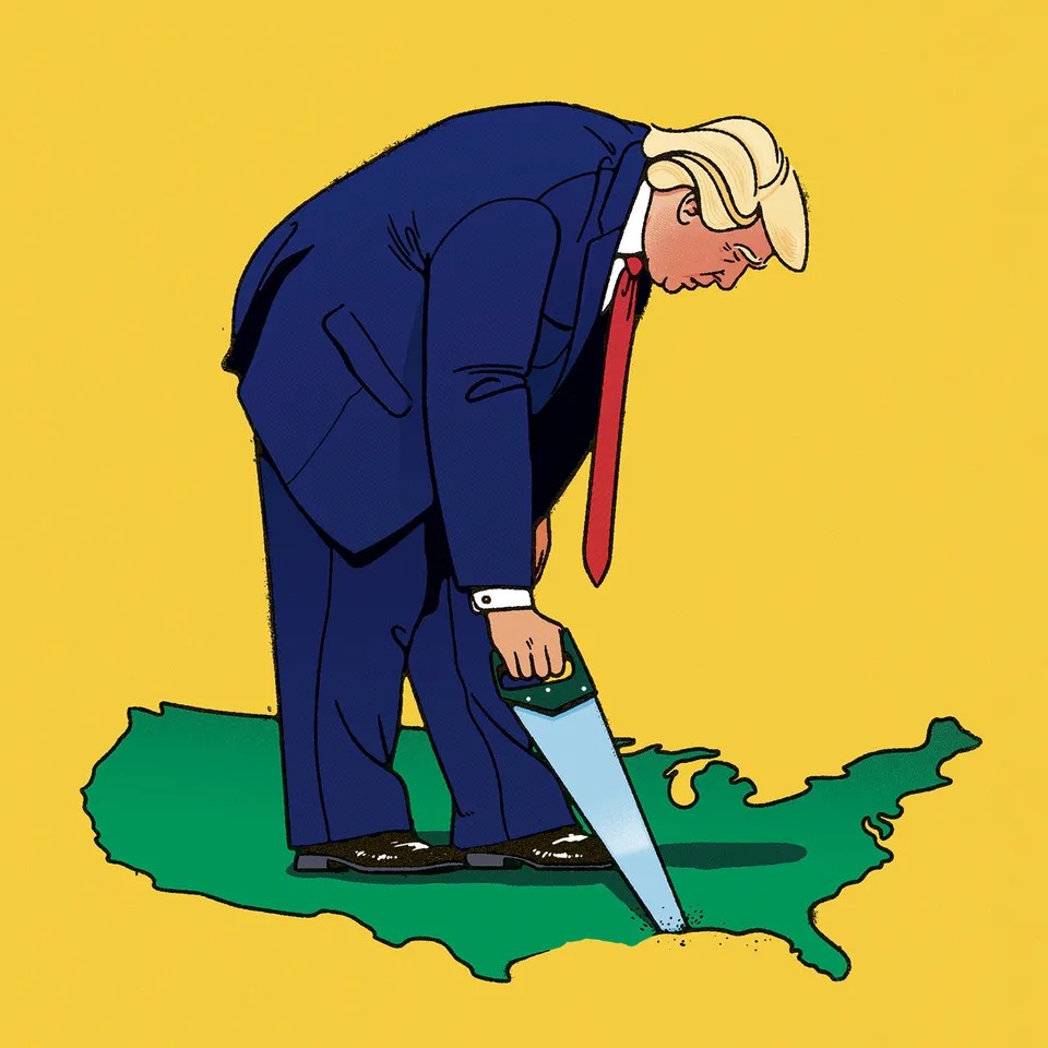 A capa da edição da revista publicada nesta quinta-feira (3) estampa uma arte de Trump abrindo um buraco abaixo de seus pés com um serrote, no formato do mapa dos EUA. No texto, a revista afirma que o presidente “cometeu o erro econômico mais profundo, prejudicial e desnecessário da era moderna”.